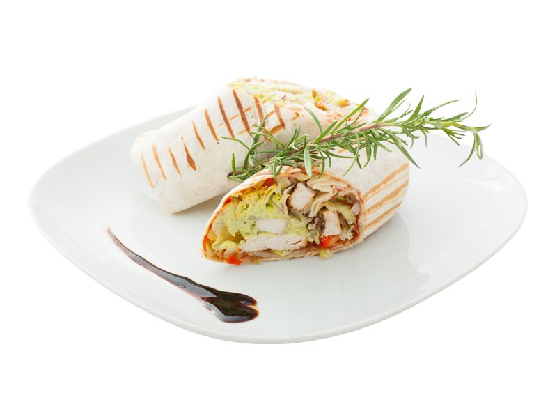 Tortilla with chicken in soy sauce and a pinch of cinnamon, with fresh vegetables, guacamole and garlic sauce.