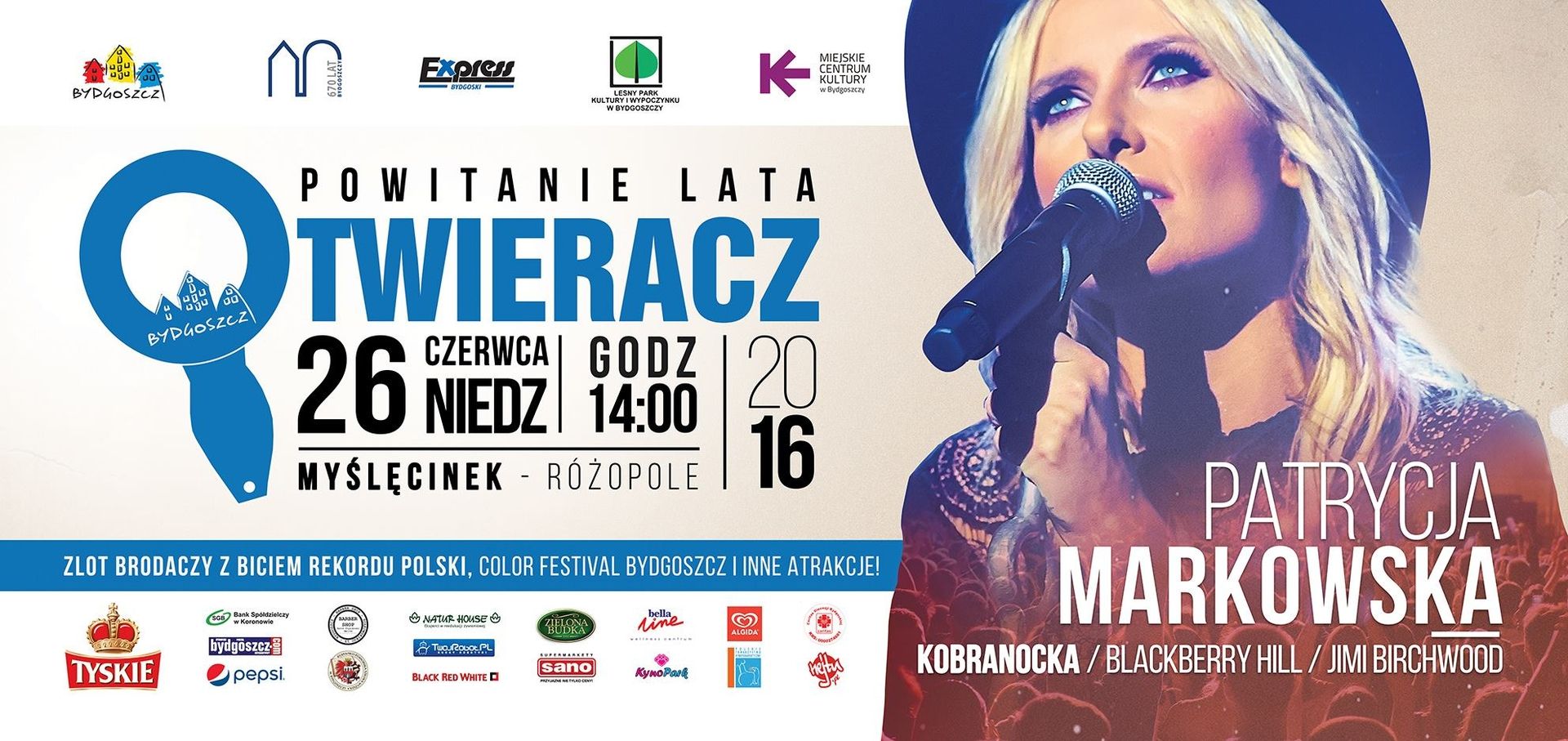 Color Festival, Zlot Brodaczy, występy bydgoskich zespołów: Blackeberry Hill i Jimi Birchwood, a na deser Kobranocka i Patrycja Markowska. Zapraszamy 26 czerwca na Otwieracz/Powitanie lata!