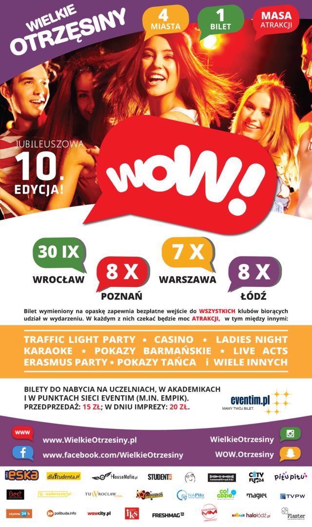Nadciąga jubileuszowa edycja WOW! Wielkich Otrzęsin – imprezowego maratonu klubowego w czterech miastach! Studenci Wrocławia, Warszawy, Poznania i Łodzi z impetem wkroczą w nowy rok akademicki, zaliczając najlepsze imprezowe miejscówki na mapie miasta.