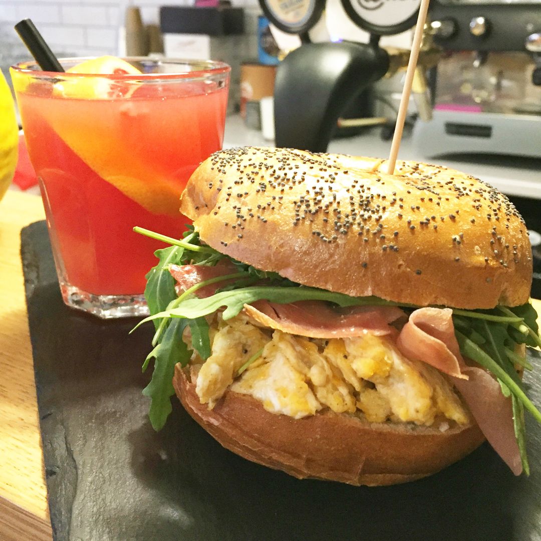• Bajgiel z jajecznicą, czipsem z szynki i rukolą