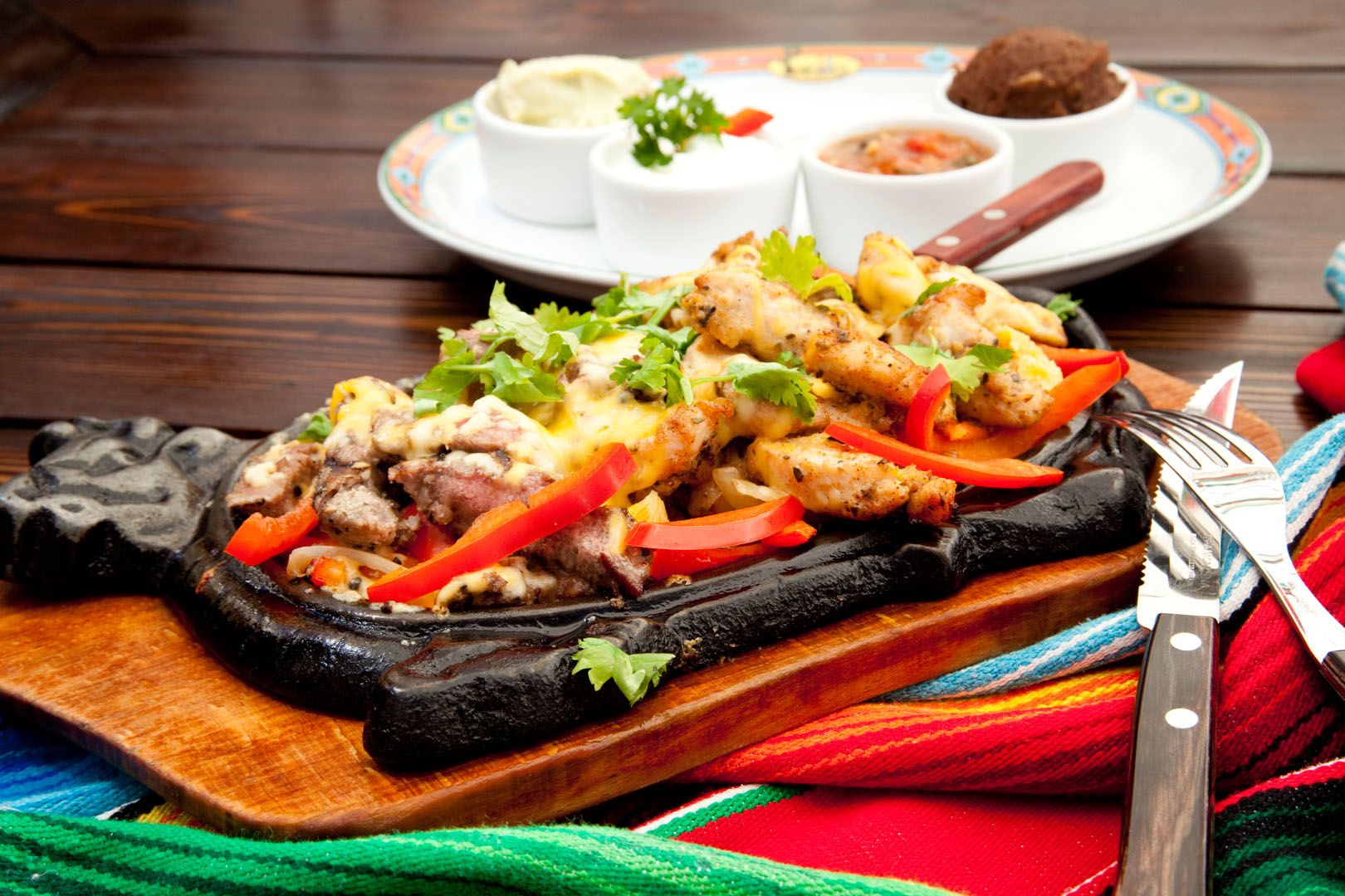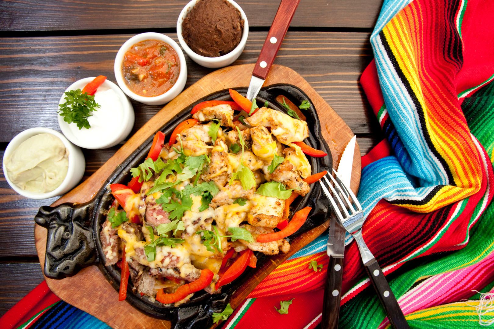 Podawane na gorącej patelni soczyste, marynowane mięso z papryką, cebulą i serem przy akompaniamencie musu z avocado, salsy Pico de Gallo, śmietany, pieczonej fasoli, świeżej kolendry oraz ciepłych tortilli. (200g/80g/160g)
