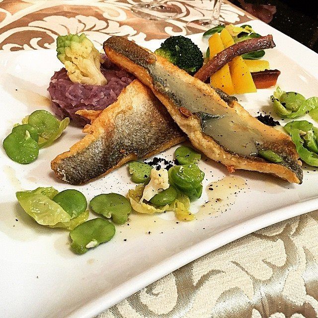 Wyśmienity filet labraksa w sosie maślano-ziołowym podany z zimniakami truflowymi, bobem, zółtą marchwią i płatkami brukselki.
