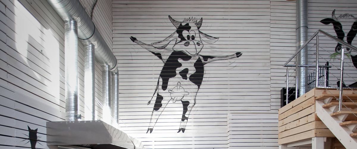 Witamy w restauracji, gdzie rządzi „krowa i kurczak”. Znajdujemy się w starej hali produkcyjnej podzielonej na dwie części. Parter jest do Waszej dyspozycji, czekają tu profesjonalne grille i stoły grillowe, na których każdy z gości może spróbować własnych sił.
