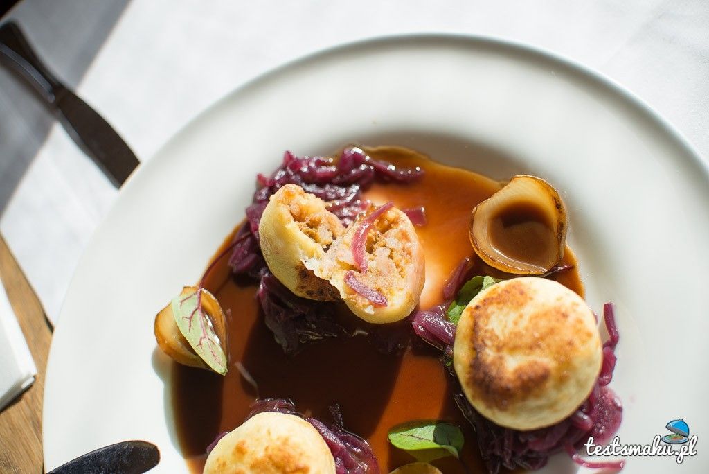 Przystawki w Tłustej Kaczce są wymyślne i oryginalne. Ciężko było się zdecydować na konkretne danie. Wszystkie nazwy brzmią tak wytwornie i smacznie, że samo czytanie pobudzało soki trawienne do działania. W końcu wybraliśmy pyzy z kaczką, które zostały podane na marmoladzie z cebuli, z sosem demi glace i pieczoną szalotką. Co to był za smak! Wspaniałe miękkie ciasto, wypełniono niezwykle aromatycznym, soczystym mięsem kaczki. Smaki przełamano wytrawnymi nutami cebuli, którą podano w postaci gęstej, ciemnej marmolady.