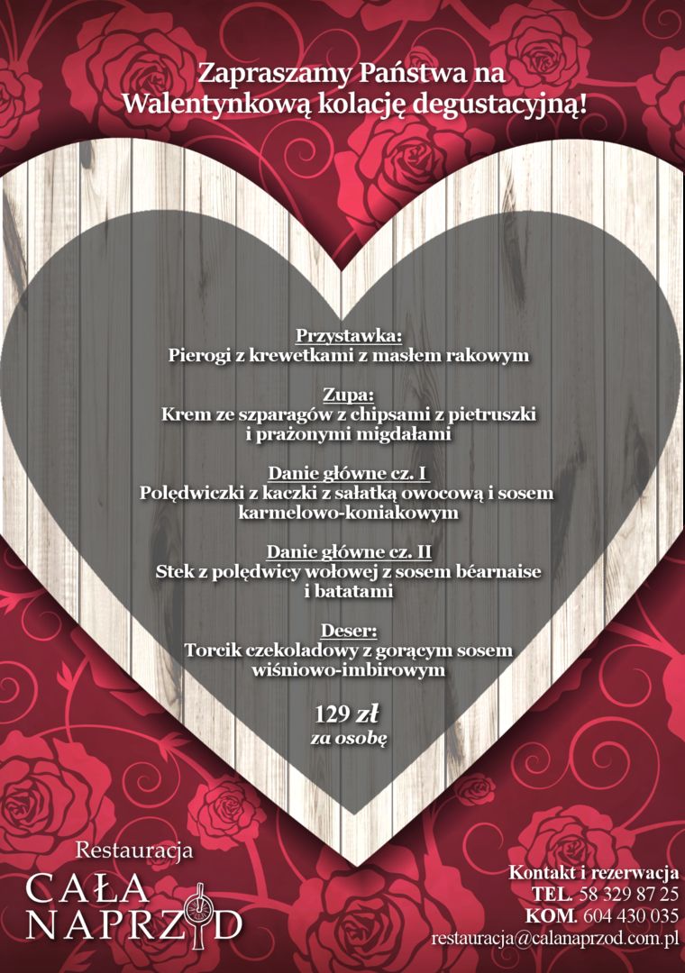 Rezerwacja: 58 329 87 25 lub restauracja@calanaprzod.com.pl