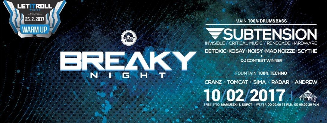 W związku z kolejnym Breaky Night nie zabraknie również licznych konkursów. Dla młodych, utalentowanych djów i producentów przygotowaliśmy DJ CONTEST, w którym zwycięzca zostanie wybrany przez SUBTENSION’a! Oprócz tego do zgarnięcia również będą karnety na LET IT ROLL WINTER 2017 w Pradze!