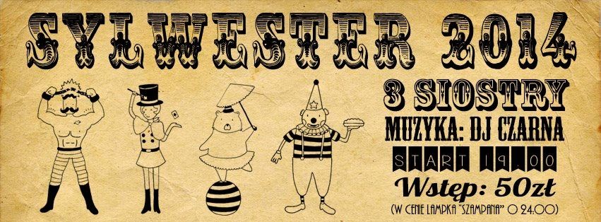 W tym roku zapraszamy na Sylwestrową noc w 3 Siostrach wszystkich klaunów, akrobatki, siłaczy, poskramiaczy lwów, magików, wróżki i resztę cyrkowego taboru, na niezapomnianą, szampańska zabawę w atmosferze rodem z „La Strada” czy „Wieczóru Kuglarzy”. Przywitamy nowy rok w rytm hitów serwowanych przez DJ Czarną, jednak północ to tylko początek prawdziwej zabawy. Zapraszamy!