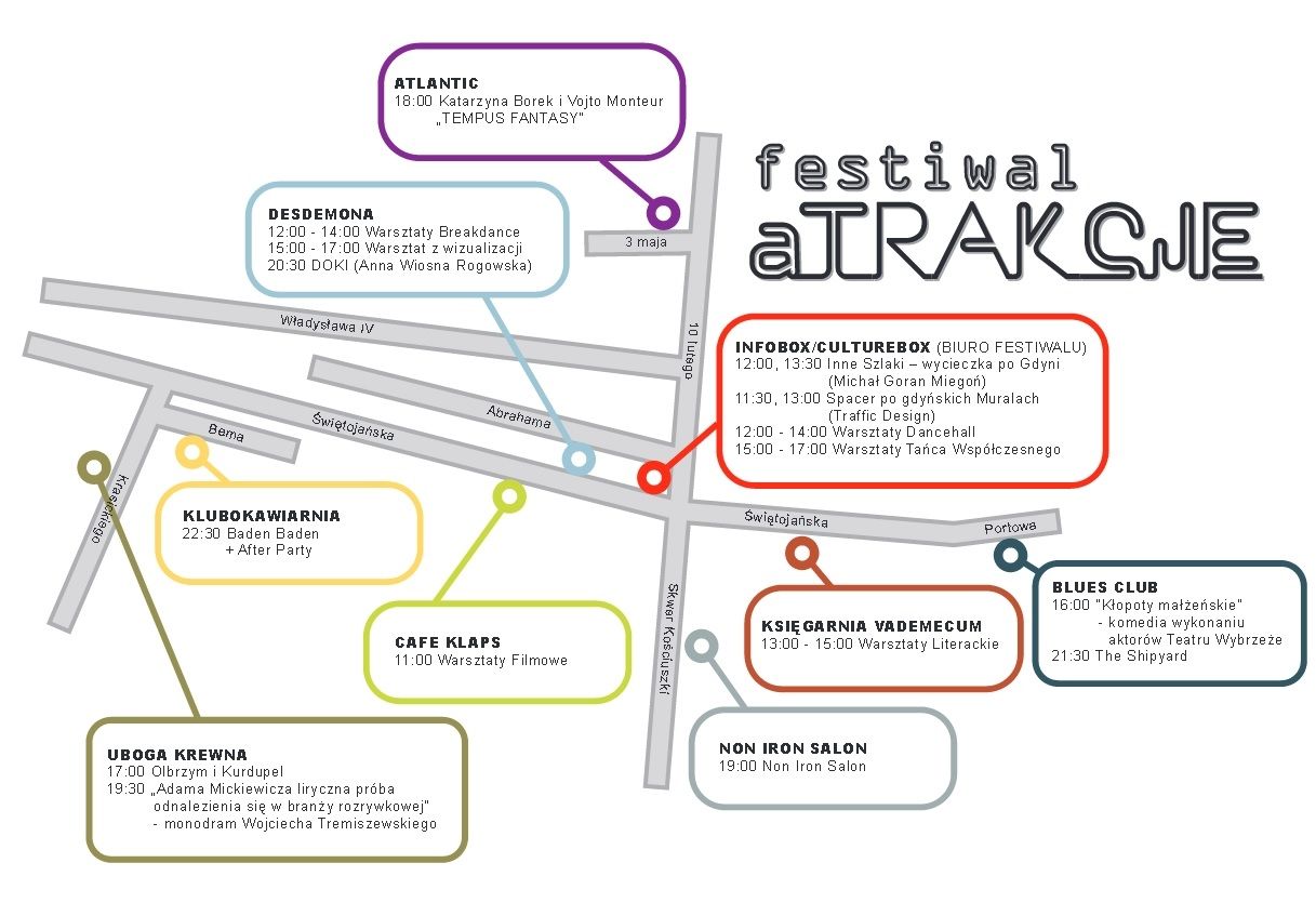 13:30 – 14:30 Inne Szlaki – wycieczka po Gdyni 2 (Michał Goran Miegoń) – Infobox/CultureboxPrzedstawienia: