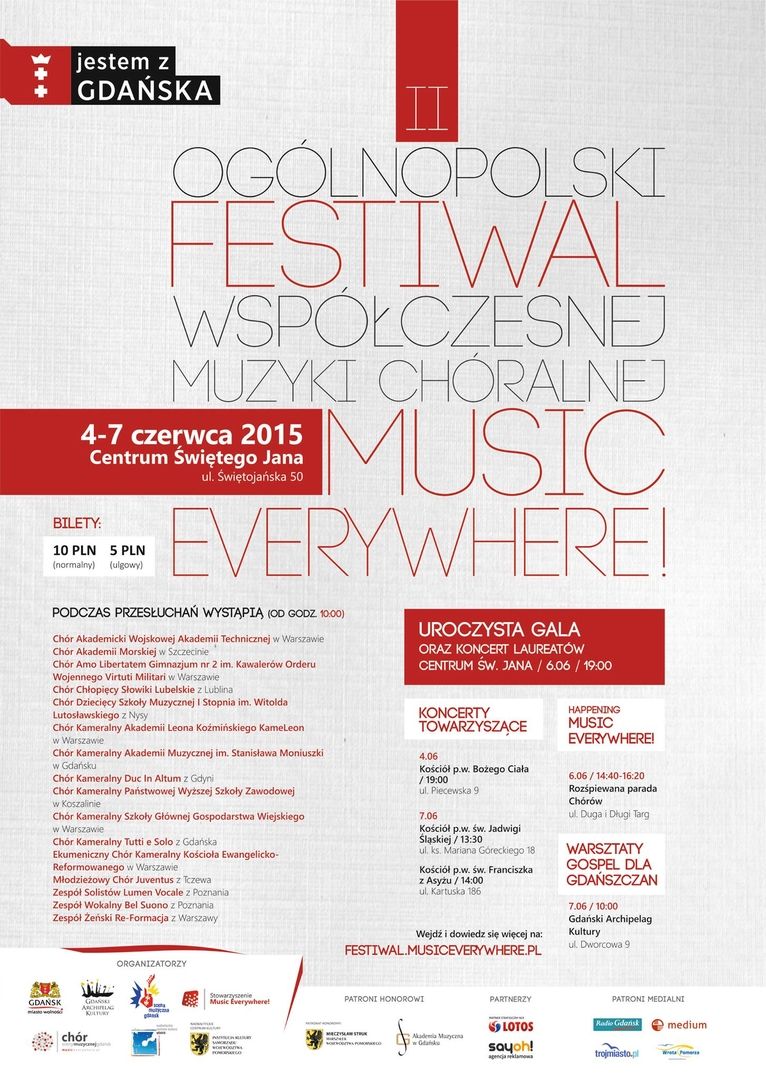 W dniach od 4 do 7 czerwca 2015r w Gdańsku odbędzie się II Ogólnopolski Festiwal Współczesnej Muzyki Chóralnej „Music Everywhere!”. Jest to wydarzenie stworzone z myślą o nowoczesnych brzmieniach chórów i zespołów wokalnych oraz jako przestrzeń do spotkań tych, którzy swym śpiewem chcą łamać schematy i pokazywać muzyczne innowacje.