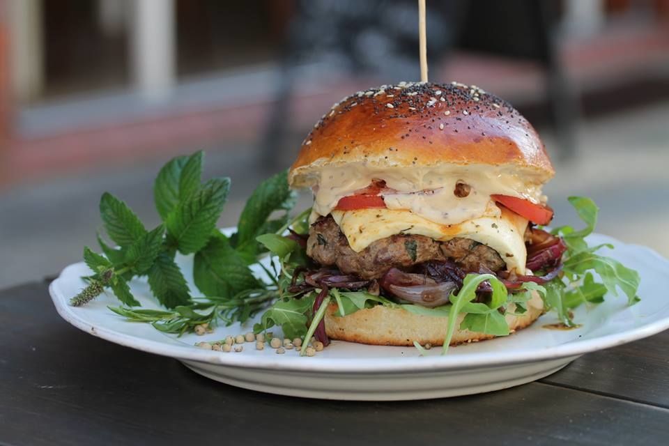 Grillowany kotlet z wołowiny zapieczony pod serem korycińskim, karczochy, grillowana cukinia, rukola, pasta z groszku cukrowego i świeżej bazylii.